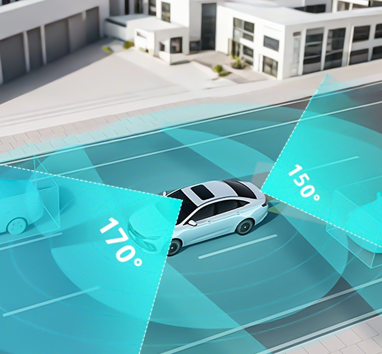 Een perfecte combinatie van een 170° ultragroothoeklens aan de voorzijde en een 150° lens aan de achterzijde geeft u een panoramisch beeld zonder blinde vlekken. De camera neemt niet alleen de weg voor u op, maar ook alles achter u, zodat er geen detail aan het toeval wordt overgelaten.