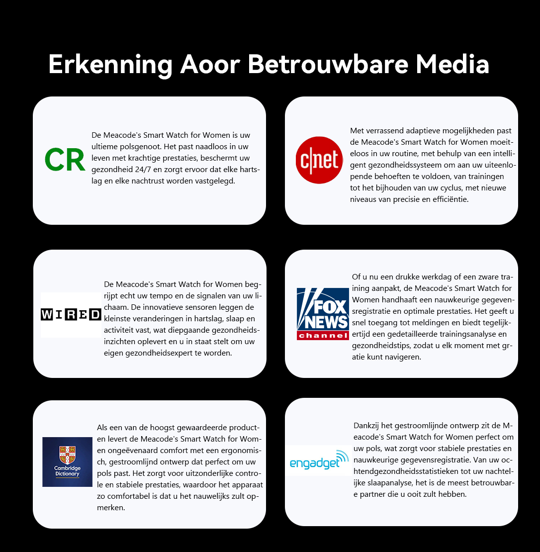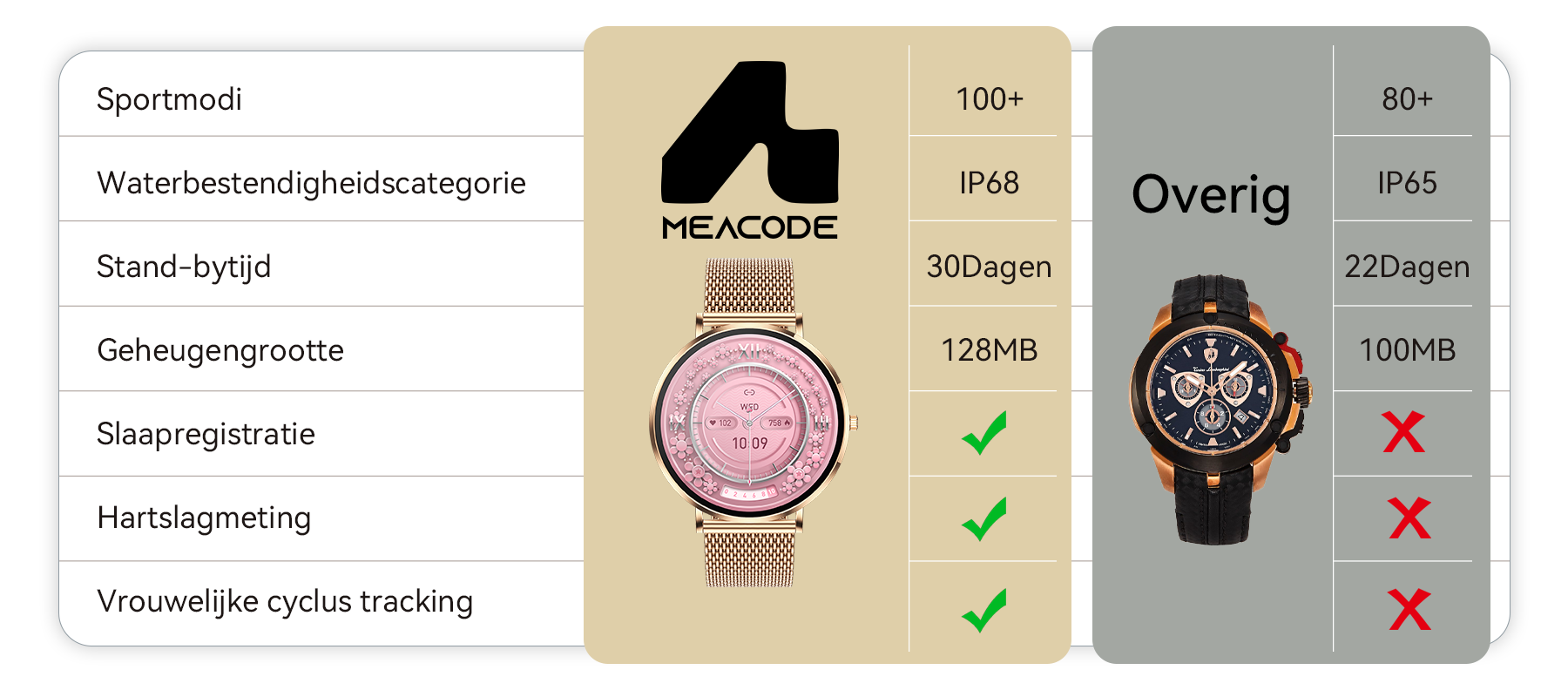 De Meacode smartwatch was haar antwoord. Het is een elegante metgezel met een ultraslank ontwerp en uitgebreide gezondheidsmonitoring. Het product werd gebouwd zodat zij nooit meer compromissen hoefde te sluiten.