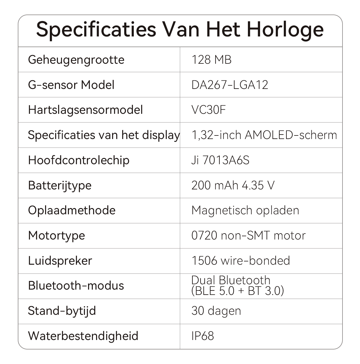 - IP68 waterbestendig: Het horloge is zweet- en regenbestendig, zodat je het met vertrouwen kunt dragen tijdens het sporten of zelfs onder de douche.